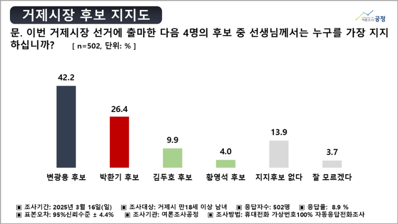 파이낸스 투데이에 따르면 여론조사전문기관 (주)여론조사공정이 석종근 행정사사무소 의뢰로 지난 16일, 만18세 이상 남녀 유권자 502명을 대상으로 조사한 '거제시장 후보지지도 조사' 결과, 변광용 42.2%, 박환기26.4%, 김두호 9.9%, 황영석 4.0% 순으로 조사됐다.