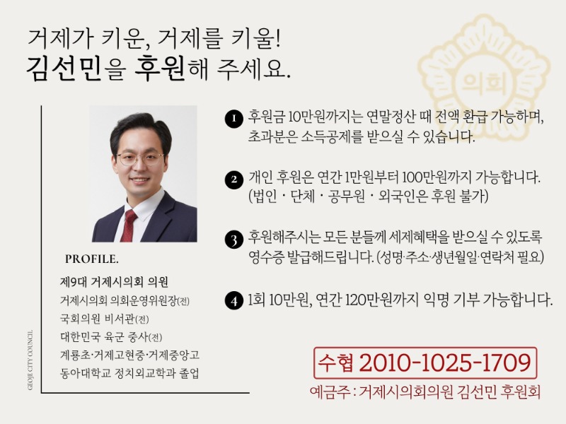 거제시의회 김선민 의원(국민의힘, 고현‧장평‧수양)이 거제시의회 최초로 지방의회의원 후원회를 설립했다.