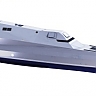 - 전기추진체계, 통합마스트, 첨단함형, 통합네트워크, 스마트 함교, 병력절감 스마트함정 등의 미래 기술이 적용된 미래형 구축함 조감도 - 음향 추적을 최소화하는 각진 모양의 스텔…