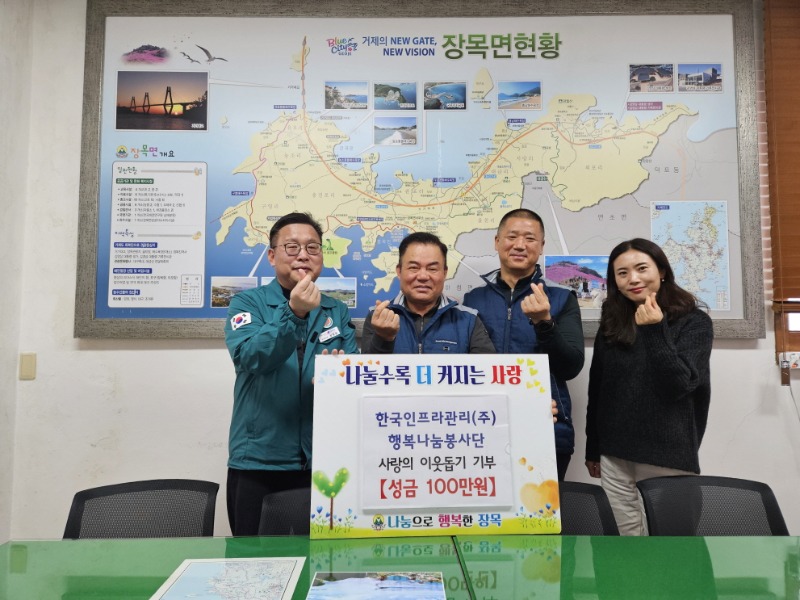 한국인프라관리(주) 행복나눔 봉사단(단장 공화철)에서 지난 19일 연말을 맞아 어려운 이웃을 돕기 위한 사랑의 성금 100만 원을 장목면에 전달했다.