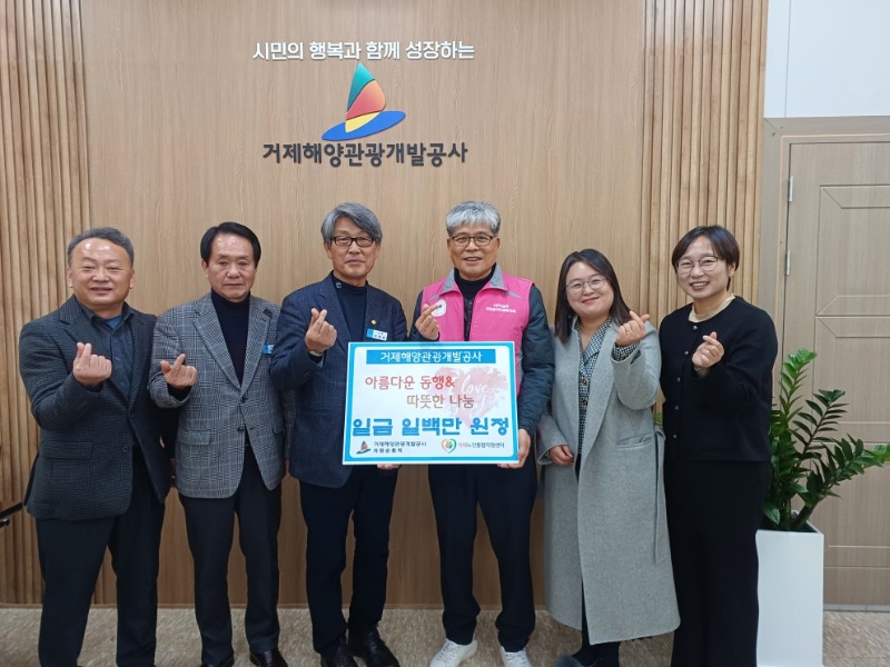 거제해양관광개발공사(사장 지영배)는 사회 공헌 활동으로 ㈔거제시자원봉사단체협의회(회장 김창규) 산하 거제노인통합지원센터(시설장 김윤정)에 100만 원을 기부했다고 4일 밝혔다.