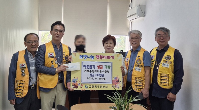 윤명희 고현동장은 “거제중앙라이온스클럽 회원들께서 매번 흔쾌히 이웃돕기 성금을 기탁해주셔서 감사드린다”며 “여러분의 따뜻한 관심과 사랑이 어려운 이웃들에게 큰 힘과 용기가 될 것”이라고 전했다.