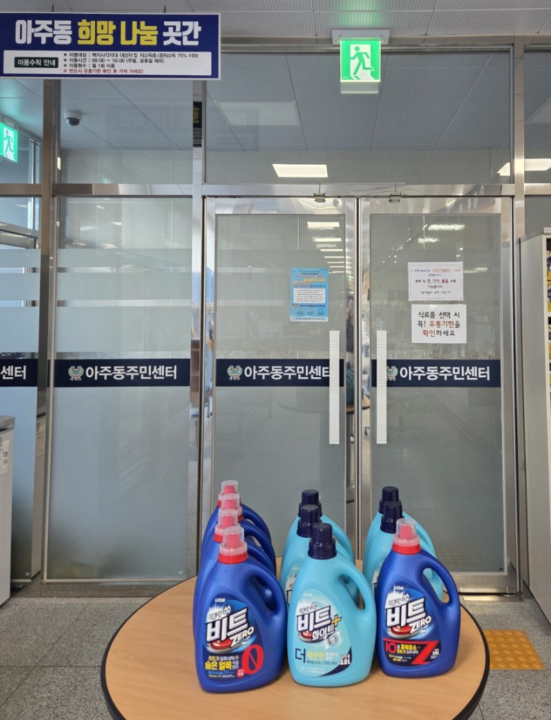 아주동 주민 전정순씨가 지난 5일, 아주동주민센터를 방문하여 15만 원 상당의 세탁세제를 희망나눔곳간에 기탁했다.