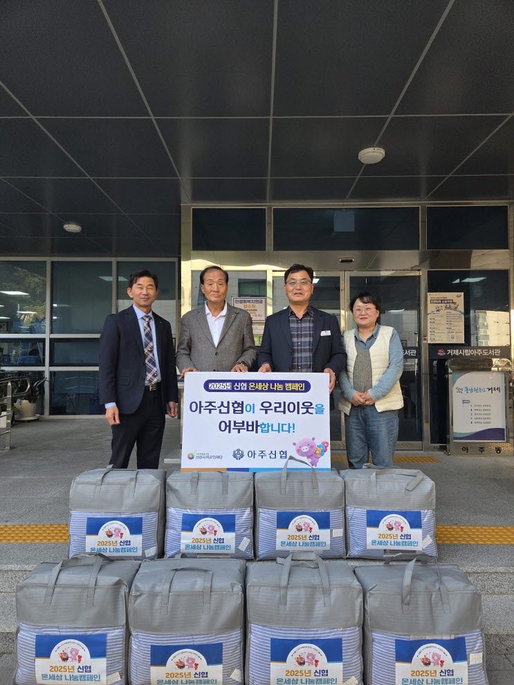거제시 아주동에 소재한 아주신협(이사장 윤상찬)은 지난 25일, 본격적인 추위에 대비하여 따뜻한 겨울이불 8채를 아주동주민센터에 전달했다.
