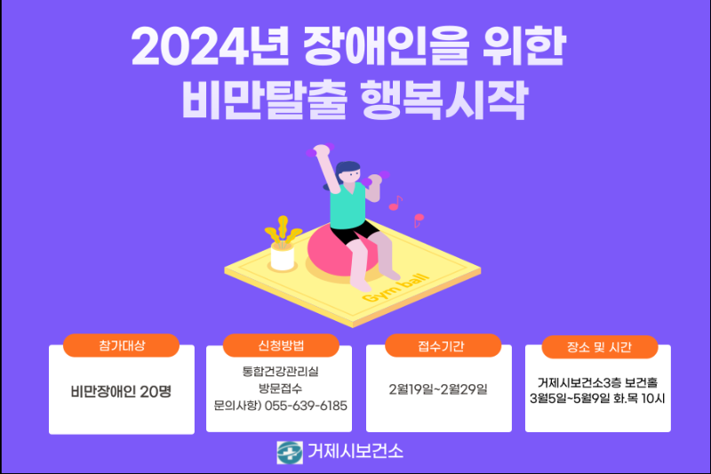 신청 대상은 2월 19일부터 2월 29일까지 거제시민 중 비만장애인 남성, 여성, 체지방률 기준으로 선착순 20명을 모집한다. 참가 희망자는 보건소 통합건강관리실(055-639-6185)로 문의하면 된다.