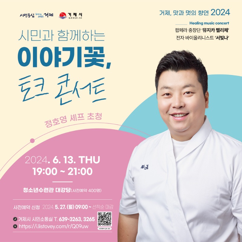 작년에 이어 두 번째 개최되는 이번 토크콘서트는 ‘거제, 맛과 멋의 향연’이라는 주제로 대한민국 최고의 일식 요리연구가 정호영 쉐프를 초청하여 이야기를 나눌 예정이다.