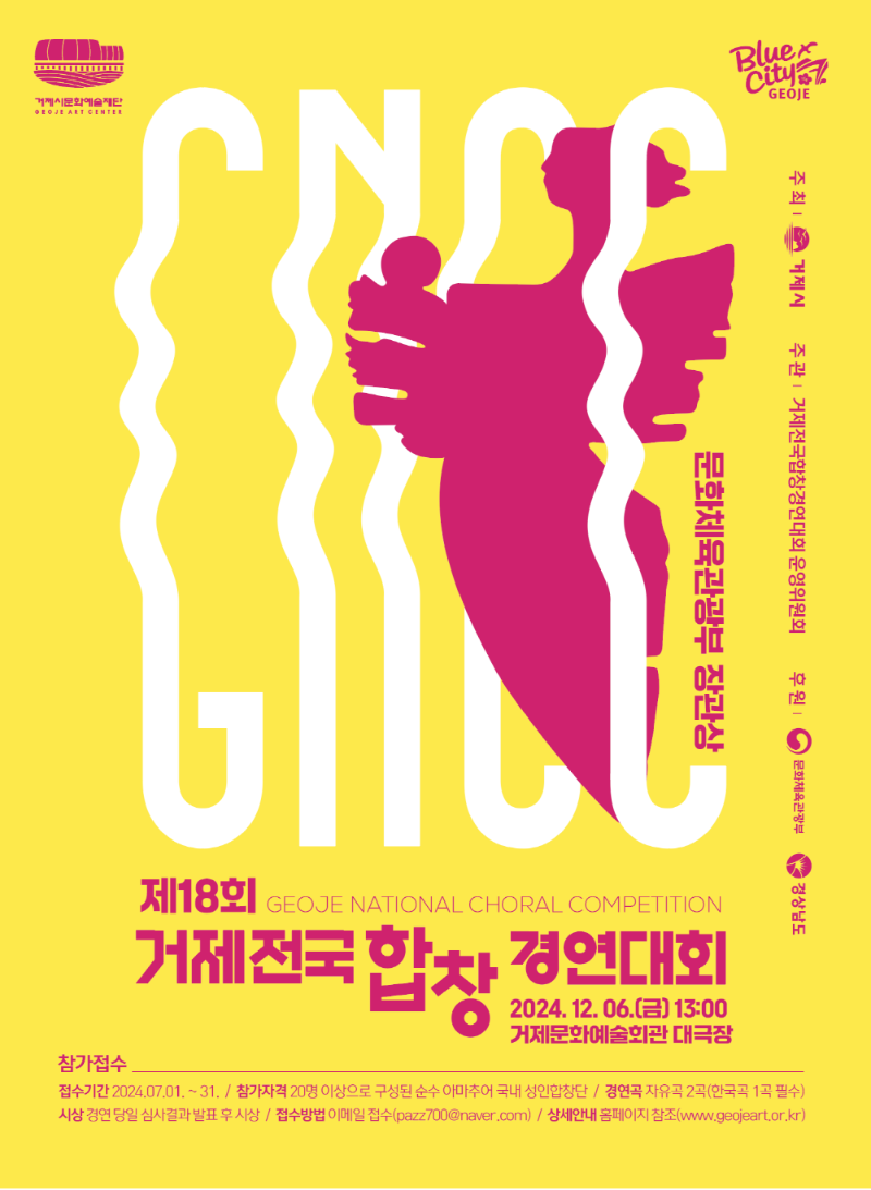 ‘제18회 거제전국합창경연대회’는 거제시가 주최하고 거제전국합창경연대회 운영위원회가 주관하며 문화체육관광부와 경상남도가 후원한다. 참가팀 접수 등 자세한 사항은 거제문화예술회관 홈페이지(www.geojeart.or.kr) 또는 전화(055-680-1010)를 통해 확인할 수 있다.