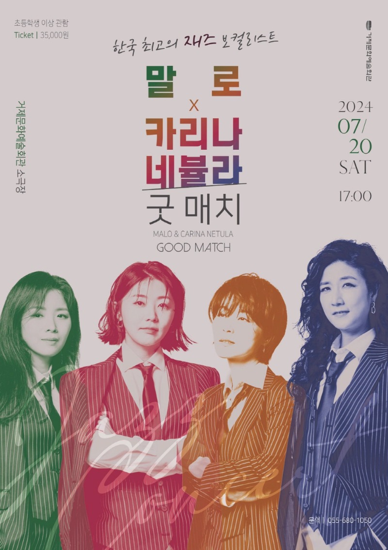 한편, 한국 최고의 재즈 보컬리스트들이 한 자리에 모인다는 사실만으로도 가슴을 두근거리게 만드는 이번 《말로×카리나 네뷸라》 재즈 콘서트는 오는 7월 20일(토) 오후 5시 거제문화예술회관 소극장에서 열린다. 티켓은 전석 3만 5천원으로 전화 또는 인터넷으로 예매할 수 있으며 초등학생부터 관람이 가능하다.