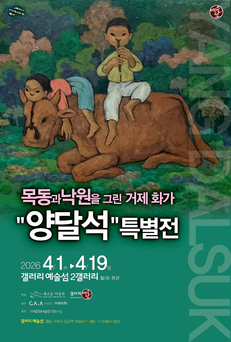 “목동과 낙원을 그린 거제 화가, 양달석 특별전”은 2026년 4월 1일부터 4월 19일까지 갤러리 예술섬(거제시 일운면 소동리. 월화 휴관) 2관에서 전시하며 무료 관람이다. 해조음미술관, 갤러리예술섬, 양달석미술관 주최, 예술법인 가이아(주) 주관, 거제문화예술협의회(가칭) 후원 이다.