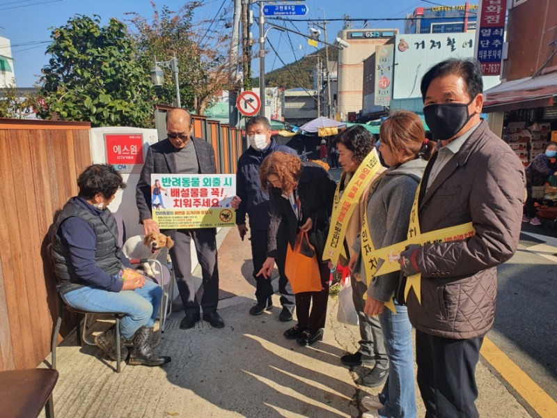 이번 캠페인은 주민자치회 분과별로 구역을 나누어 진행됐으며, 고현천, 공원뿐만 아니라 고현동민이 자주 이용하는 고현시장과 버스터미널 주변에서 배변봉투 등 홍보물품을 배부하며 펫티켓의 중요성을 알렸다.