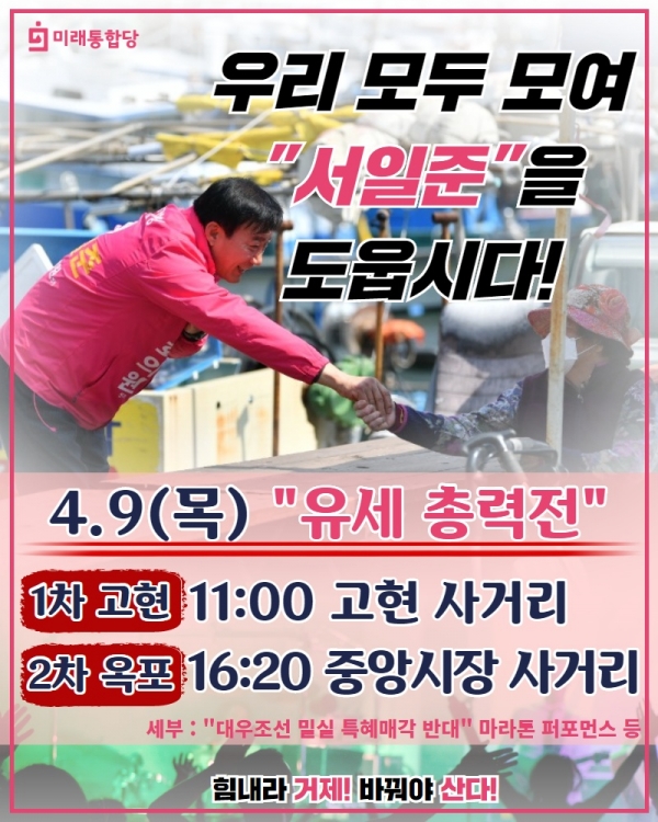 서일준 후보 선거대책본부(선대본)는 ‘힘내라 거제, 바꿔야 산다!’는 슬로건 아래 ▲1차 : 4월9일 오전 11시 고현사거리 ▲2차 : 4월9일 오후 4시20분 옥포중앙사거리에서 2회에 걸쳐 ‘필승 집중유세’를 진행한다고 밝혔다. 이후에도 일정에 따라 이 행사는 계속될 방침이다.