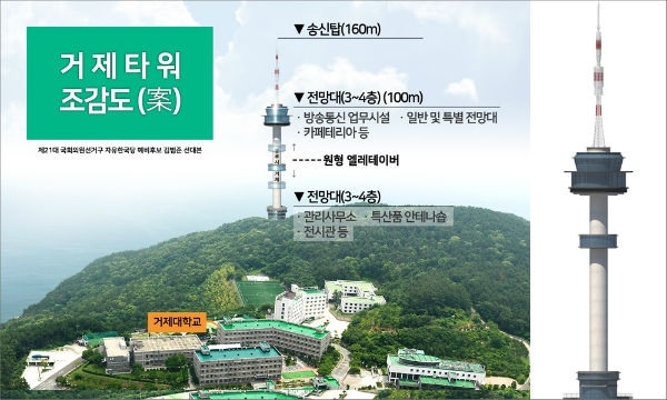 거제타워는 거제의 수려한 해안, 그리고 가깝게는 대우조선 및 옥포ㆍ장승포, 지세포의 경관과 야경 또, 멀리는 일본 대마도와 부산ㆍ창원 그리고 해금강까지 조망할 수 있는 새로운 관광자원으로 계절ㆍ기후와 관계없이 즐길 수 있는 장점이 있습니다. 거제타워와 주변 인프라 조성을 국비나 지방비 투입이 필요한 재정사업이 아니라 민자사업으로 추진하겠습니다.