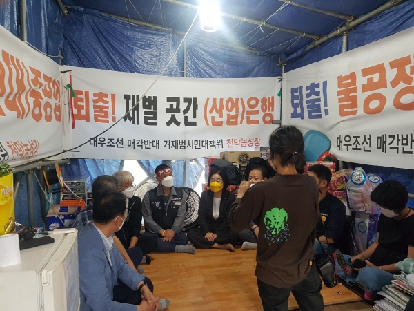 앞서 심후보는 12시30분 쯤 대우조선 정문에 설치된 ‘대우조선매각반대범시민 대책위원회’천막 농성장을 방문해 관계자들과 간담회를 가졌다.