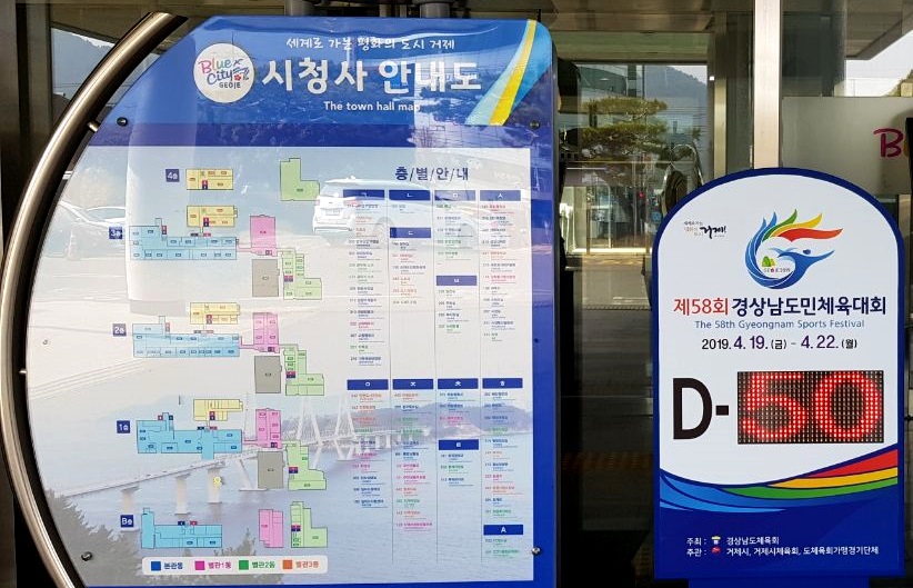 거제시가 제58회 경상남도민체육대회를 앞두고 도민체전 개최 분위기 조성에 본격적으로 나선다. 시청 1층 입구에 D-50일을 맞아 도민체전 잔여일수기를 설치했다고 밝혔다.