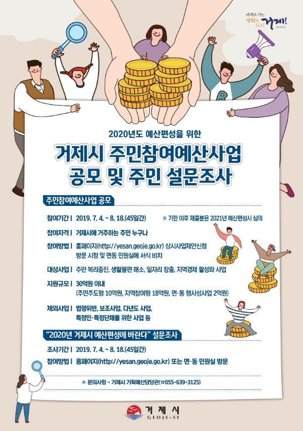 거제시는 내년도 재정운용 방향과 세출예산 분야별 우선순위 반영 등을 위해 「2020년도 예산편성을 위한 주민설문조사와 주민참여예산사업 공모」를 실시한다.