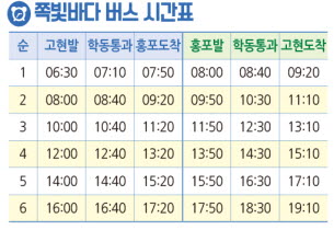 11월 말까지 한시적으로 운행하는 쪽빛바다 버스는 매주 토·일요일 06시 30분 첫차를 시작으로 약 2시간 간격으로 12회(편도) 운행하며, 버스노선은 고현 터미널에서 출발하여 문동·구천·학동·함목·저구·명사를 경유하여 홍포까지 운행하며 요금은 기존 시내버스와 동일하다.