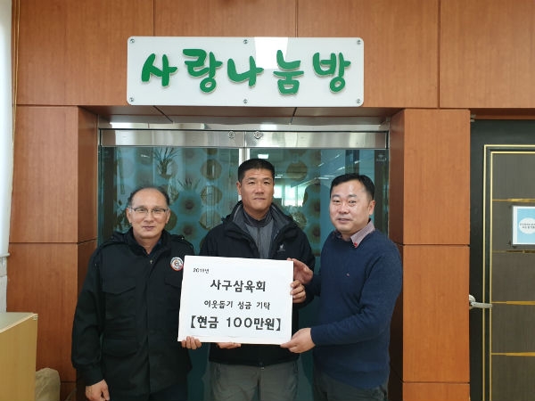 장목초등학교 49회, 장목중학교 36회 동기생 모임인 사구삼육회(회장 김동조)지난 3일 장목면사무소에 방문하여 관내 어려운 이웃에 도움을 주고자 이웃돕기 성금 100만원을 장목면사무소(면장 김형호)에 기탁했다.
