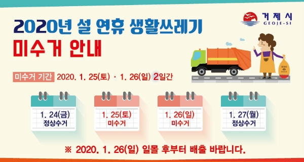 기타 설 연휴기간 생활쓰레기 수거 관련 민원사항은 거제시청 자원순환과(☎639-4815)로 문의가능하다.