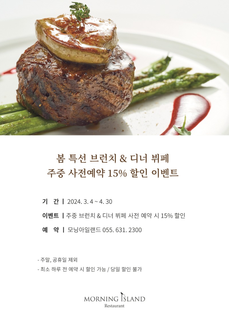 거제삼성호텔은 신학기을 맞아 거제 지역민들을 위해 3.4일부터 4.30일까지 2개월 간 봄 특선 브런치 & 디너 뷔페를 평일 사전 예약 시 15% 할인 이벤트를 실시한다.