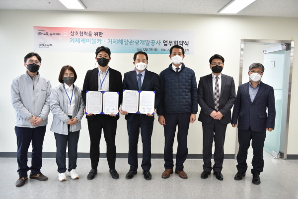 14일 거제파노라마케이블카 회의실에서 관계자 10여 명이 참석한 가운데 열린 협약식에서 양 기관은 공동 마케팅과 콘텐츠 개발을 통해 관광객 거제 유치에 뜻을 함께 하기로 했다.