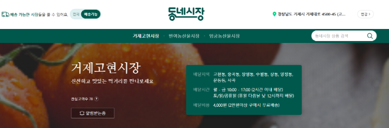 네이버 “동네시장 장보기”를 통해 거제고현시장의 신선하고 맛있는 먹거리를 만날 수 있다. 고현시장 내 상점 28점포가 서비스 입점하여 400여개 내외의 다양한 먹거리 상품을 판매하고 있으며, 온라인 구매 시 여러 점포의 물품을 묶음으로 배송받을 수 있는 서비스도 가능해 편리하게 다양한 상품을 구매할 수 있는 우리 동네 거제고현시장 온라인 마켓이다.