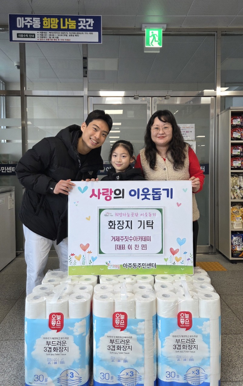 거제주짓수아카데미(대표 이찬민)는 지난 30일 아주동주민센터(동장 문성오)를 방문하여 희망나눔곳간에 화장지를 기탁하였다.