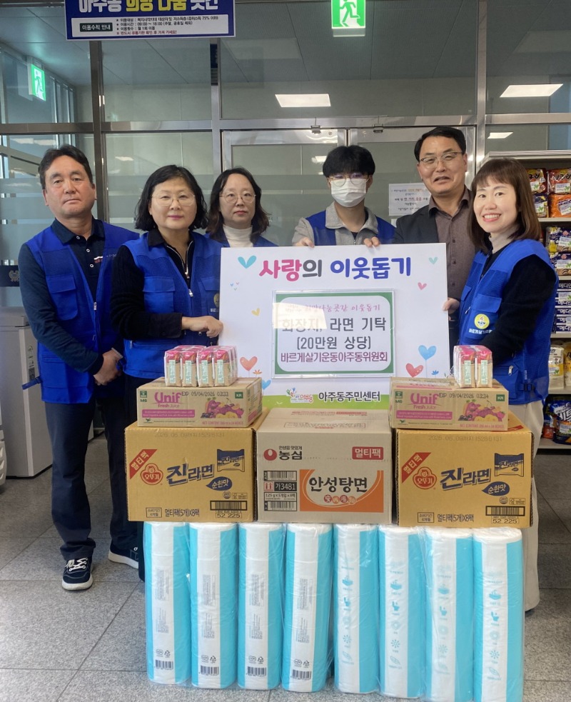 바르게살기운동아주동위원회(회장 박미경)에서 지난 16일 아주동주민센터(동장 문성오)를 방문해 20만원 상당의 화장지, 라면 등을 기탁했다.