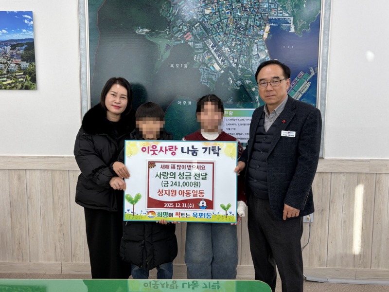 성지원 아동일동이 4년째 옥포1동에 사랑의 성금을 전달하고 있다.
