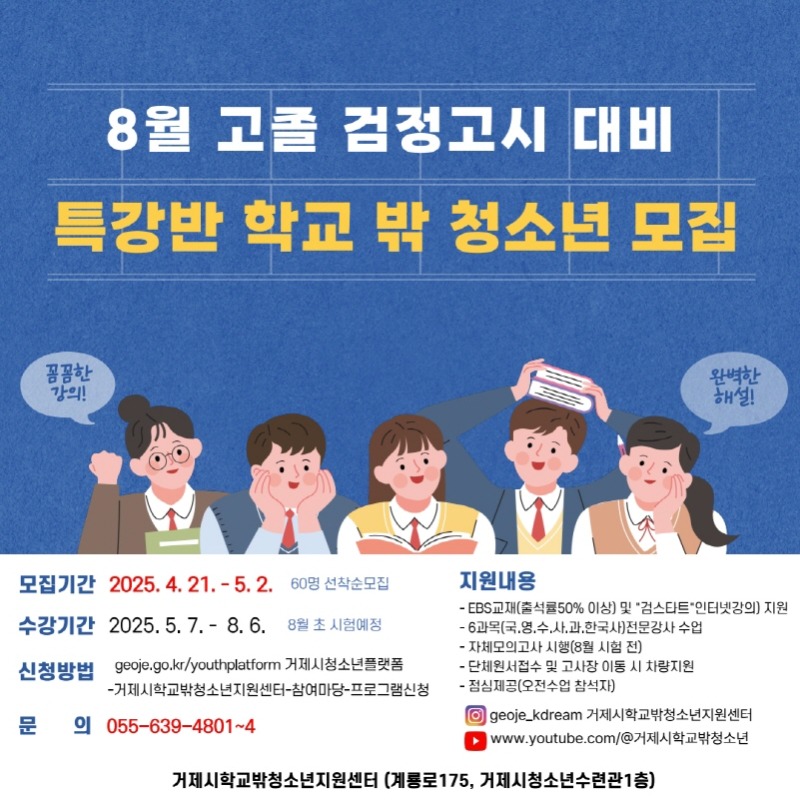 거제시학교밖청소년지원센터(센터장 서미경)에서는 2025년 5월 7일(수)부터 8월 6일(수)까지 2025년도 제2회 고등학교 졸업학력 검정고시 대비 검정고시특강반에 참석할 학교 밖 청소년을 모집한다.