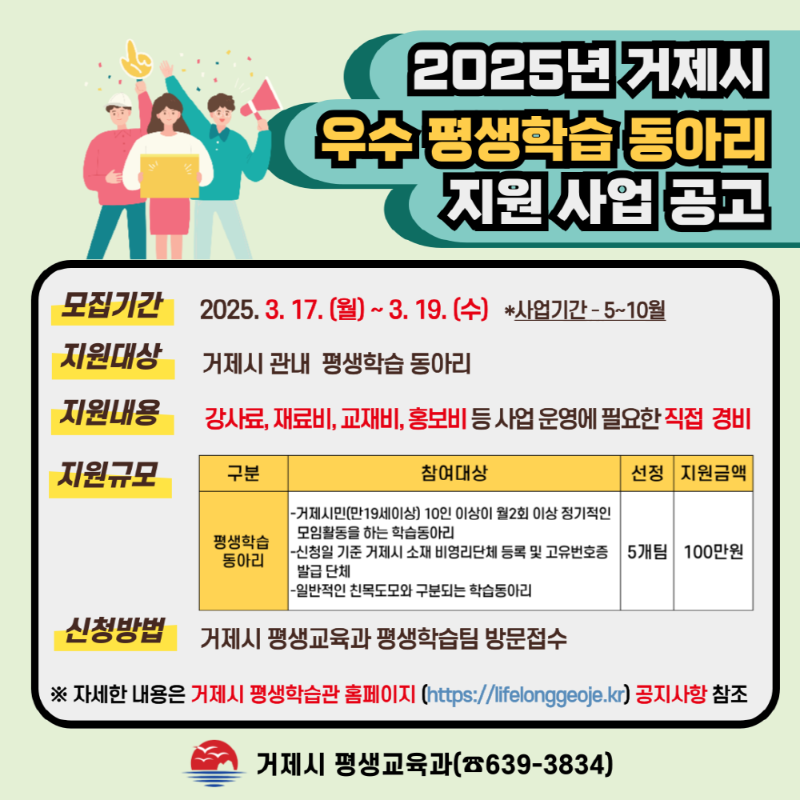거제시가 지역사회 학습공동체 형성과 배움문화를 조성하기 위해 ‘2025년 거제시 우수 평생학습 동아리 지원사업’을 실시한다.