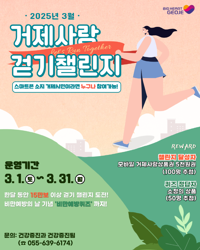거제사랑 걷기 챌린지에 대한 문의는 보건소 건강증진과(055-639-6174)로 하면 된다.