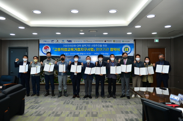 거제대학교(총장 허정석)는 27일 거제시시실에서 거제시와 13개 기관이 참석한 가운데 '2022년 고등직업교육거점지구 사업' 협약식과 함께 고등직업교육혁신위원회 발족식을 가졌다.