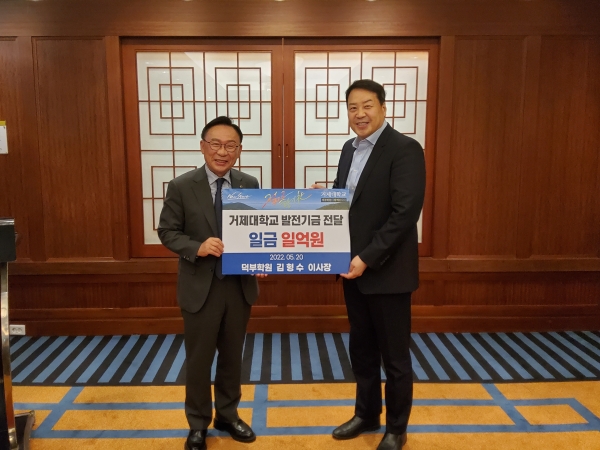 거제대학을 인수한 덕부학원 김형수 이사장이 지난 20일 개인사재를 털어 학교발전기금 1억원을 쾌척했다.