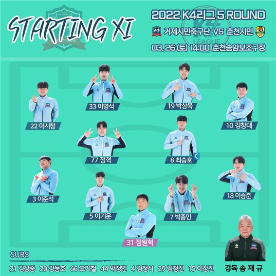 거제시민축구단은 26일(토) 춘천송암스포츠타운 보조구장에서 진행된 춘천시민축구단과의 2022 K4리그 5라운드 원정 경기에서 0-2 패배를 기록하였다.