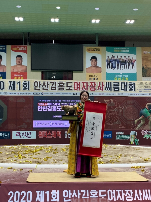 올 시즌 ‘무패의 신화’ 이다현선수가 제1회 안산김홍도여자장사씨름대회에서 원년 무궁화장사에 등극하며 시즌4관왕을 차지했다.