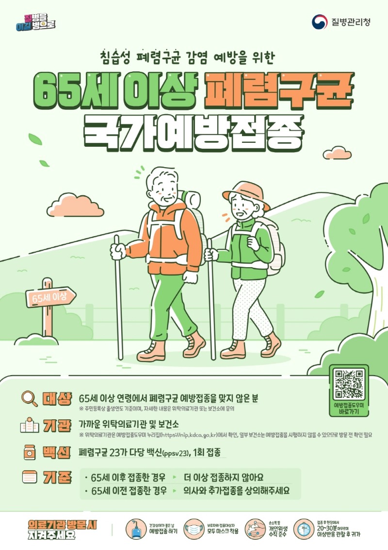 이와 함께 폐렴구균 예방접종 대상은 65세 이상 어르신으로 1961년 12월 31일 이전 출생자가 해당된다. 폐렴구균 감염증은 폐렴, 균혈증, 수막염 등 중증 질환으로 이어질 위험이 높아 예방접종이 중요하며, 대상자는 가까운 지정 의료기관 또는 보건소에서 접종 가능 여부를 확인한 후 접종할 수 있다.