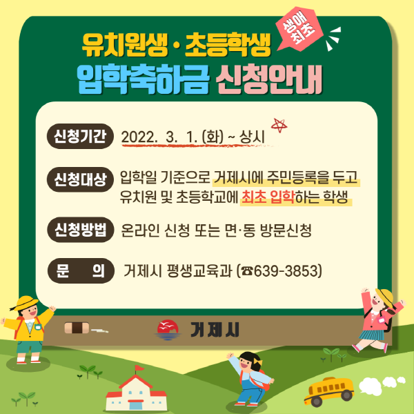 지원대상은 입학일 기준 보호자와 함께 거제시에 주민등록을 한 유치원 및 초등학교 최초입학자이며, 거제시 어린이집 입학축하금, 다자녀입학축하금, 타 시군 입학축하금과 중복 신청자는 제외 대상이다.