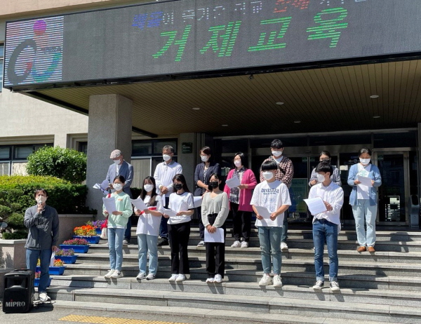 거제교육연대는 14일 거제교육청 앞에서 기자회견을 갖고 정치인과 국가가 어린이 청소년의 이야기기에 귀를 기울여 달라고 촉구했다.
