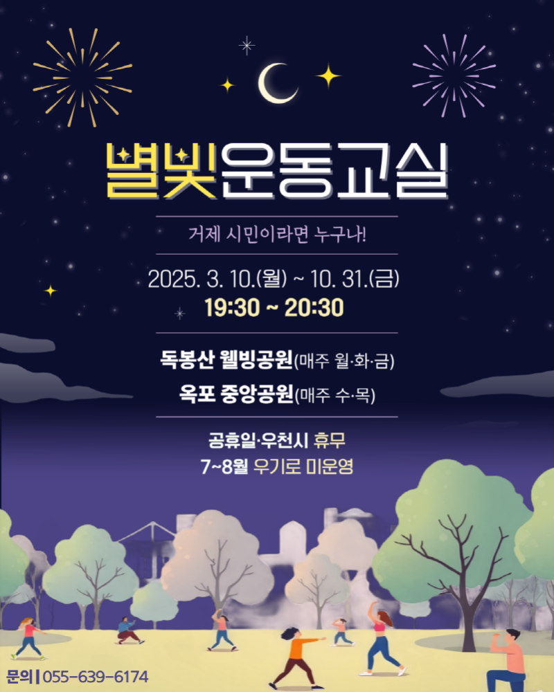 거제시 보건소는 바쁜 일상으로 낮시간 운동이 어려운 지역 주민의 규칙적인 신체활동 실천을 돕기 위해 저녁 시간을 활용한 ‘2025년 별빛 운동교실’을 오는 3월 10일부터 10월 31일까지 운영한다고 밝혔다.