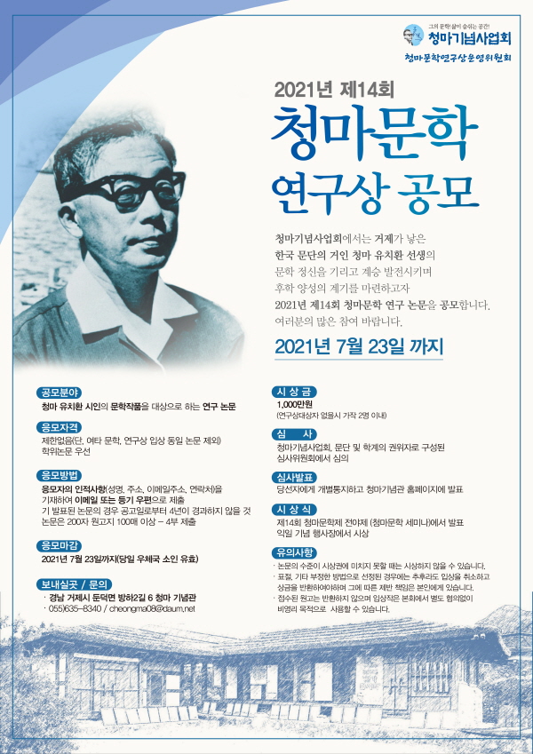 청마기념사업회(회장 양재성)는 2021년 제14회 청마문학연구상 당선자를 발표했다.