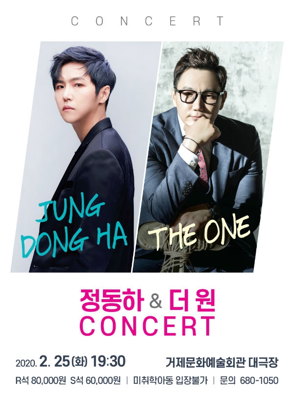 <정동하 & 더원 콘서트>는 2020년 2월 25일(화) 오후7시30분 거제문화예술회관 대극장에서 열리며 입장료는 R석 8만원, S석 6만원이다. 전화 또는 인터넷으로 예매가 가능하며, 공연과 예매에 관한 자세한 사항은 거제문화예술회관 홈페이지(www.geojeart.or.kr) 또는 전화(055-680-1050)를 통해 확인할 수 있다.