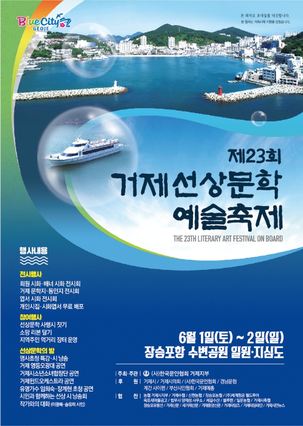 거제시가 후원하고 한국문협 거제지부(회장 이금숙)가 주관하는 제23회 거제선상문학예술축제가 오는 6월1일부터 2일까지 양일간 장승포항 수변공원 및 외도유람선상, 지심도 일원에서 시와 노래와 음악이 어우러진 축제행사로 열린다.