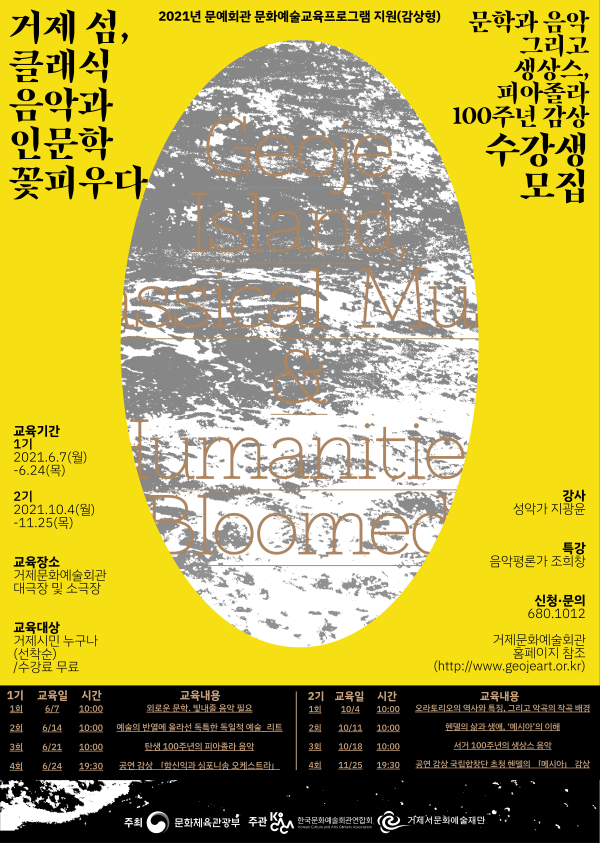 한편, 성인을 대상으로 한 클래식 교양 강좌 <거제 섬, 클래식 음악과 인문학 꽃피우다>는 문화체육관광부 국고 지원사업 ‘2021 문예회관 문화예술교육 프로그램 지원사업’의 일환으로 문화체육관광부가 주최하고 한국문화예술회관연합회와 (재)거제시문화예술재단이 주관한다.