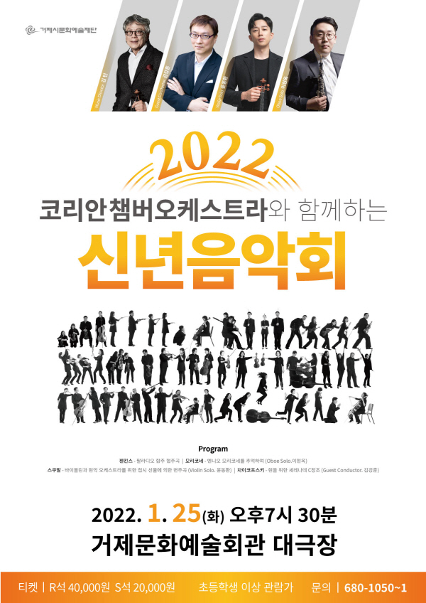 거제시문화예술재단(이사장 변광용)은 오는 2022년 1월 25일(화) 오후 7시 30분 거제문화예술회관 대극장에서 코리안 챔버 오케스트라와 함께하는 2022 <신년음악회>를 개최한다.