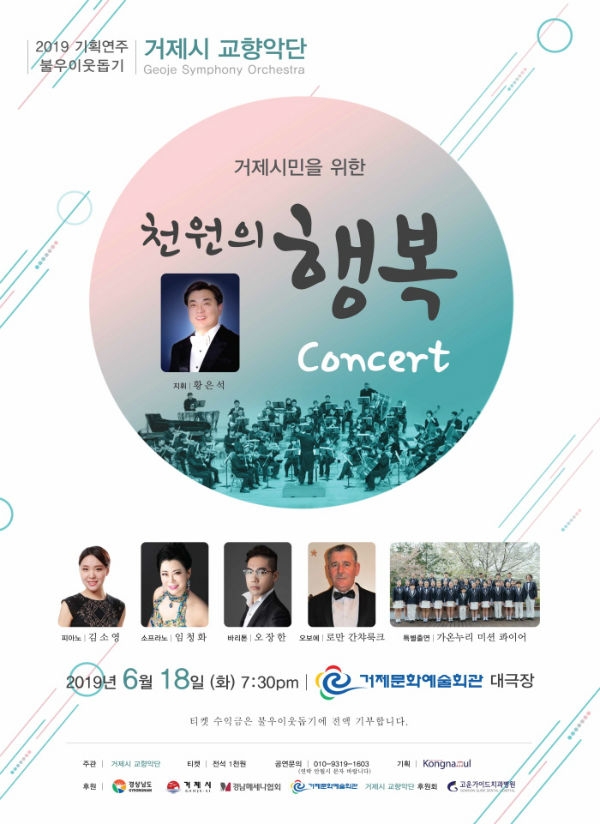 거제시교향악단(단장 서용찬/ 감독 황은석)이 준비한 2019 기획연주 ‘거제시민을 위한 천원의 행복 콘서트’가 오는 18일 오후 7시30분 거제문화예술회관 대극장에서 열린다.