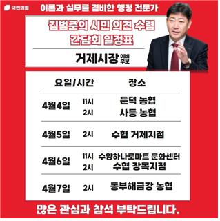 김범준 예비후보는 지난 3월 예정되었으나 거제시의 전격적인 간담회 장소 사용불허 결정으로 일정이 무산된 면·동 방문 거제시민 청취회가 4월 4일을 시작으로 다시 순차적으로 개최된다고 알려왔다.