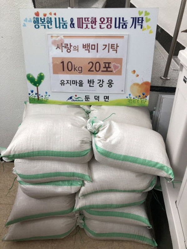 반강웅씨(80세. 둔덕면 유지마을)가 지난 18일 둔덕면사무소를 방문하여 코로나19로 어려움을 겪고 있는 취약계층에 전달해 달라며 쌀(10kg) 20포를 기탁했다. 반씨는 20여 년 동안 한 해도 거르지 않고 해마다 쌀을 기부해 지역사회의 귀감이 되고 있다.