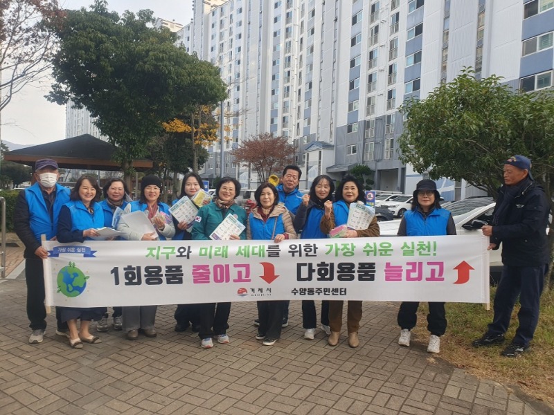 수양동 주민센터는 지난 11월 25일 삼성쉐르빌 아파트 단지와 하나로마트 앞에서 ‘생활 속 1회용품 줄이기 실천 캠페인’을 전개했다. 이날은 바람이 강하고 추운 날씨에도 불구하고 많은 주민들이 캠페인 활동에 관심을 보이며 참여했다.