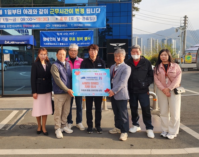 (사)거제시자원봉사단체협의회(김창규 회장) 위탁기관, 거제시자원봉사센터(김창호 센터장)는 거제시장애인복지관(우성기 관장)의 장애인 가정을 추천받아 거제현대서비스(윤상규 대표, 경남 거제시 연초면 연하해안로 316)와 장애인의 날을 맞이하여 온기나눔 사회공헌활동으로 장애인 가정의 차량 10대를 선정해 총 200만원 상당의 자동차 정비 재능기부 봉사활동을 펼쳐 지역사회에 큰 감동과 호평을 얻었다.