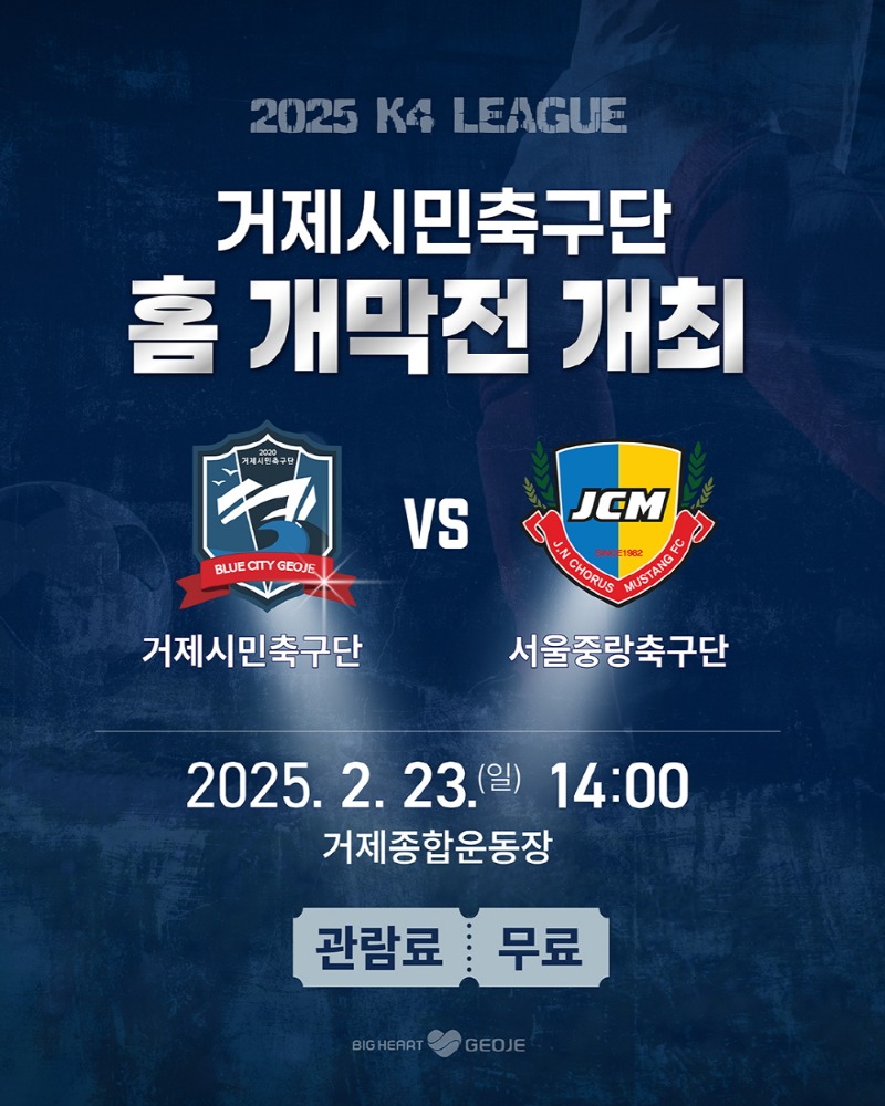 거제시민축구단이 오는 23일(일) 오후 2시 거제종합운동장에서 서울중랑축구단과의 홈 경기를 시작으로 2025년 K4리그 새 시즌을 맞이한다.